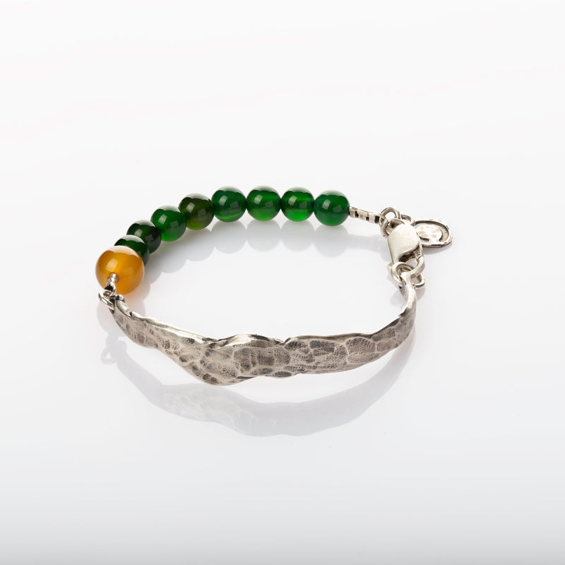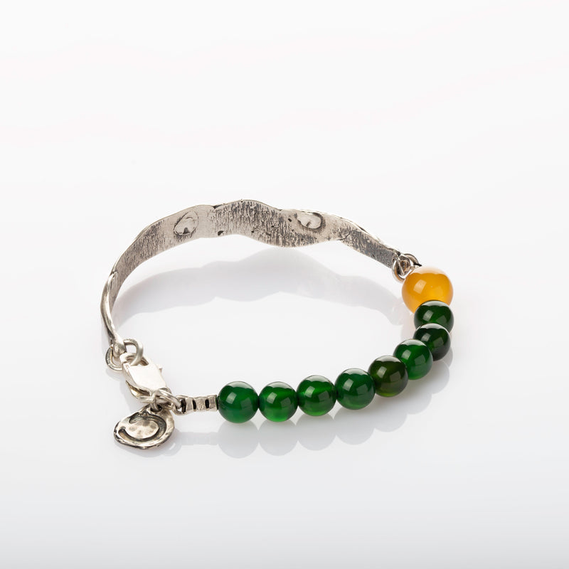 Made of 925 silver on one half, and green and yellow agate gemstones on the other.